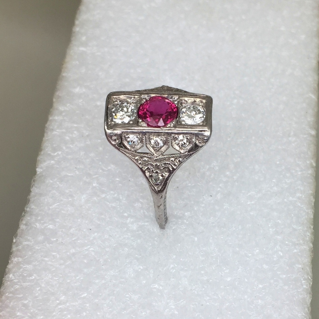 It features a vibrant natural Burmese ruby and sparkling, clean, and white antique cut diamonds. The ruby exhibits strong fluorescence under UV light!
