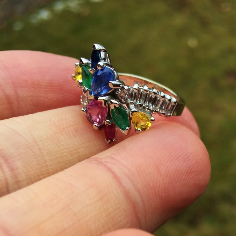 Note: Bright and natural multi color Sapphires along with a ruby and 2 emeralds. Set in a custom made 18 karat gold ring with one carat of clean and white Baguette diamonds. Unique and beautiful ring!
