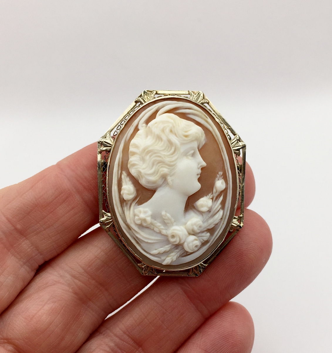 Note: This is a beautiful antique 14-karat white Gold Carnelian Shell Cameo from the early 1900s. It is in excellent condition!