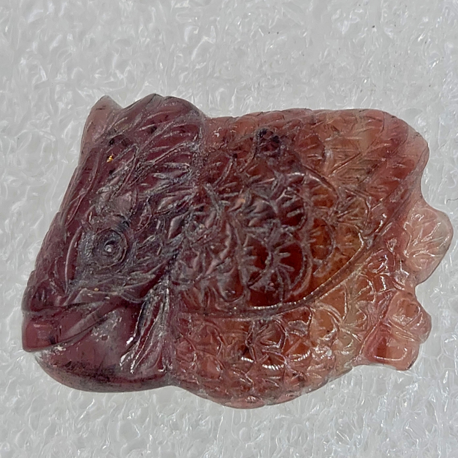 Note: Natural, multi-color banded Pink Tourmaline hand-carved into a stylized Koi. This transparent estate piece showcases vibrant layers of yellow, orange, and purple. Notable for its expressive, oversized lip detail and excellent clarity. Ideal for a custom pendant or mineral collection."