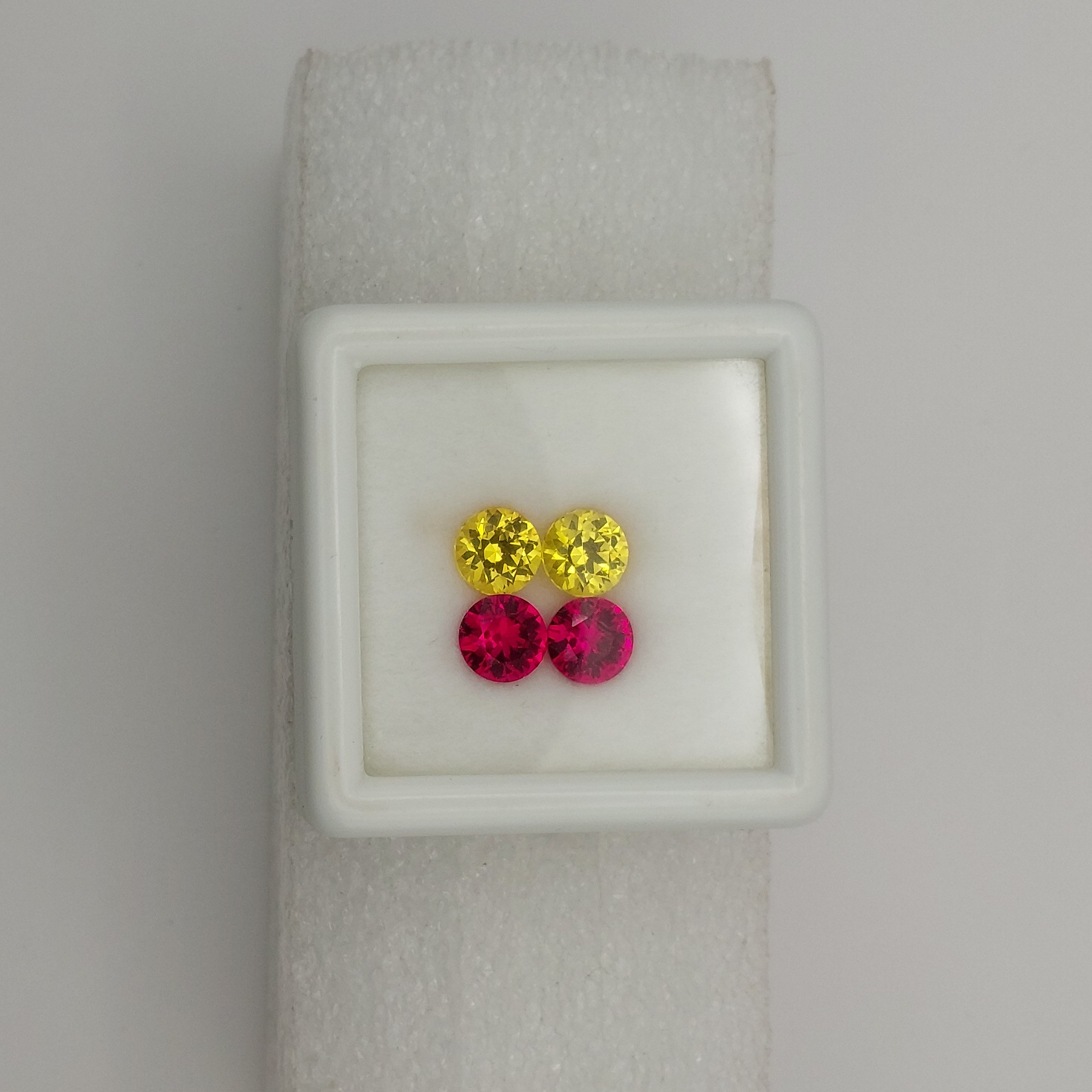 Note: Matched pairs 7 mm Lab grown Ruby Corundum and yellow sapphire. Bright gems with perfect cutting and intense color.